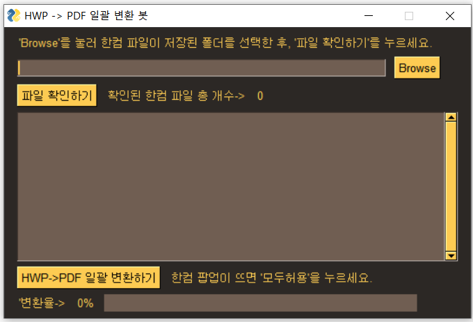 압축 해제로 생성된 HWP_PDF_변환툴(돈보다 시간) 응용 프로그램을 실행하면 아래와 같은 창이 열립니다.