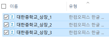 선택된 폴더에 3개의 HWP 파일이 있다면 위와 같이 표시됩니다. 파일의 수가 많아서 한 페이지에 모두 표시가 되지 않을 경우, 오른쪽에 있는 슬라이드 바를 스크롤하여 확인 가능합니다.