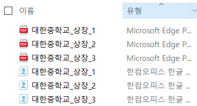 HWP에서 PDF로 변환 완료된 파일은 동일 폴더에서 확인이 가능합니다. 유형을 클릭하면 hwp, pdf 등 파일 유형으로 분류가 됩니다.