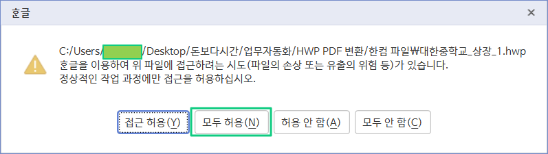 아래와 같이 한컴 자동 편집에 대한 권한 허용 여부를 묻는 팝업 창이 뜨면 '모두 허용'을 선택합니다.