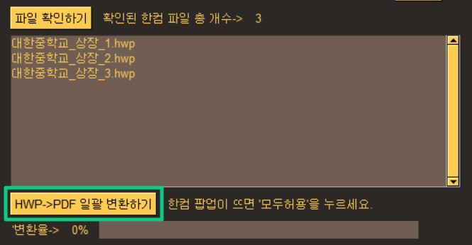 변환코자 하는 파일이 확인되었다면, '아래 HWP->PDF 일괄 변환하기' 버튼을 누릅니다.