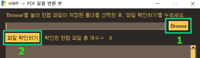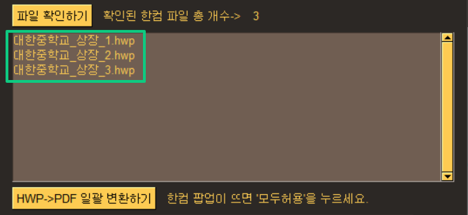 위 2번 위치에 있는 '파일 확인하기'를 눌러 PDF로 변환할 HWP 파일들이 제대로 인식되었는지 확인합니다.